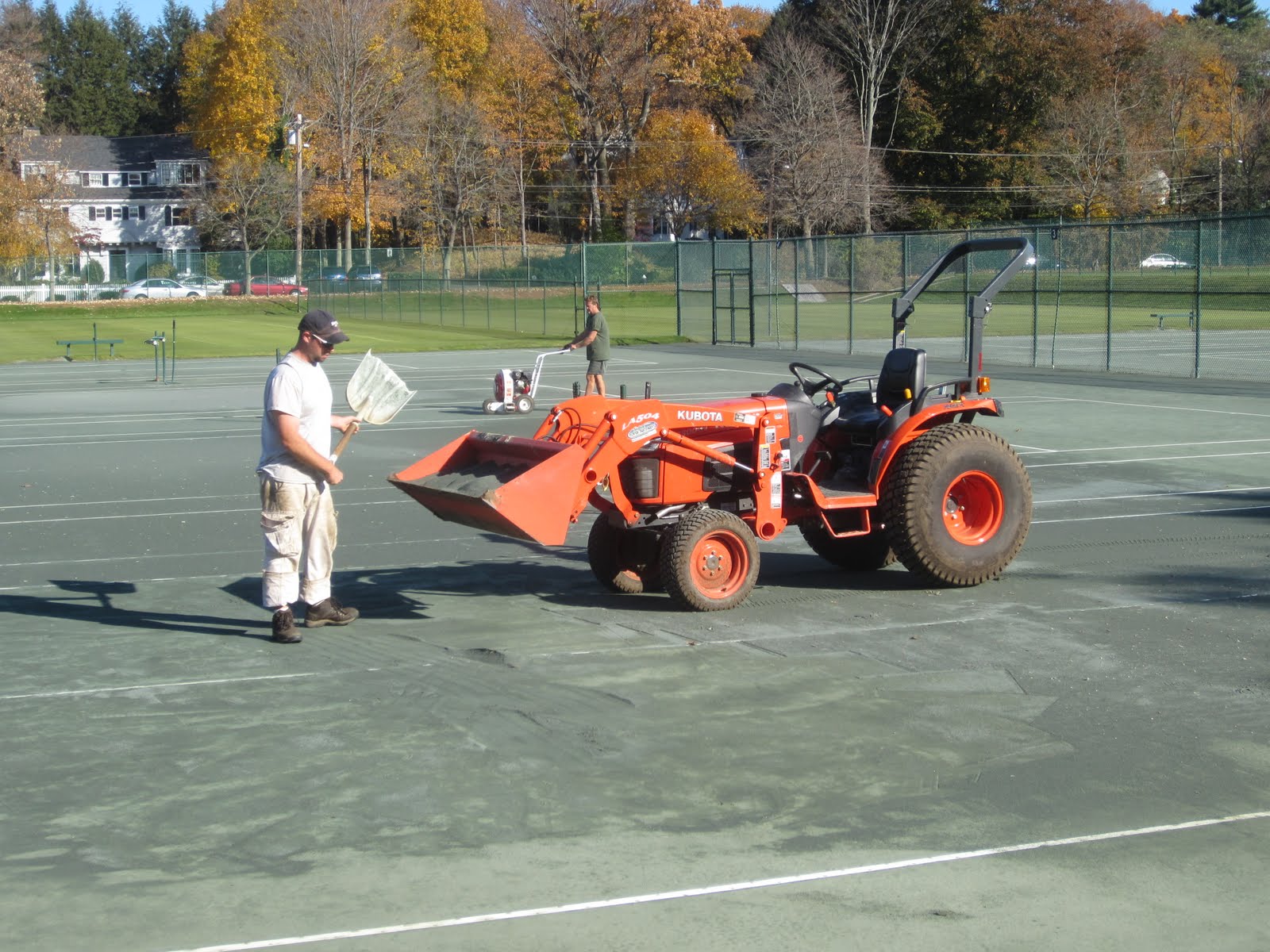 Final aeration of the season. The deep tine aerator goes beyond the usual depth of 3-4 inches of a typical greens aerator. In the video, Jeff has the depth set at 8 inches. Having our own machine affords lots of flexibility, allowing us to take advantage of wonderful days like today - 60 and dry. It may sound counter intuitive, but the aeration and decompaction of the soil now will lead to healthier, firmer grass courts next season. MB